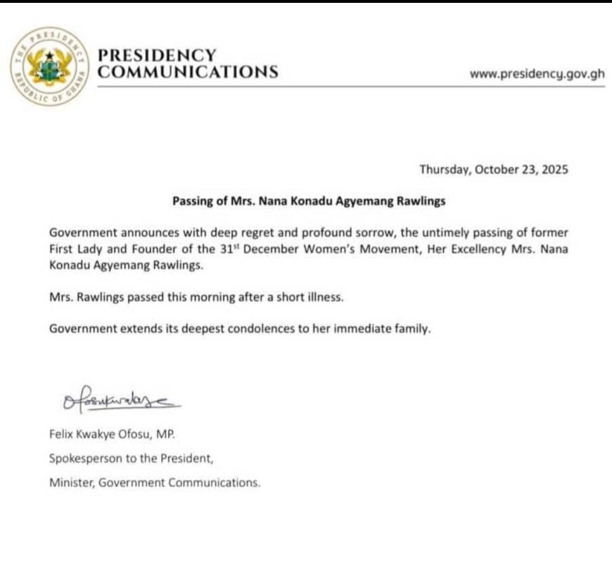 According to information gathered, the former First Lady reportedly died in the early hours of Thursday, October 23, at the Ridge Hospital in Accra. Born on November 17, 1948, in Cape Coast, in the Central Region, Nana Konadu lived a life marked by service, resilience, and advocacy for women’s rights.
